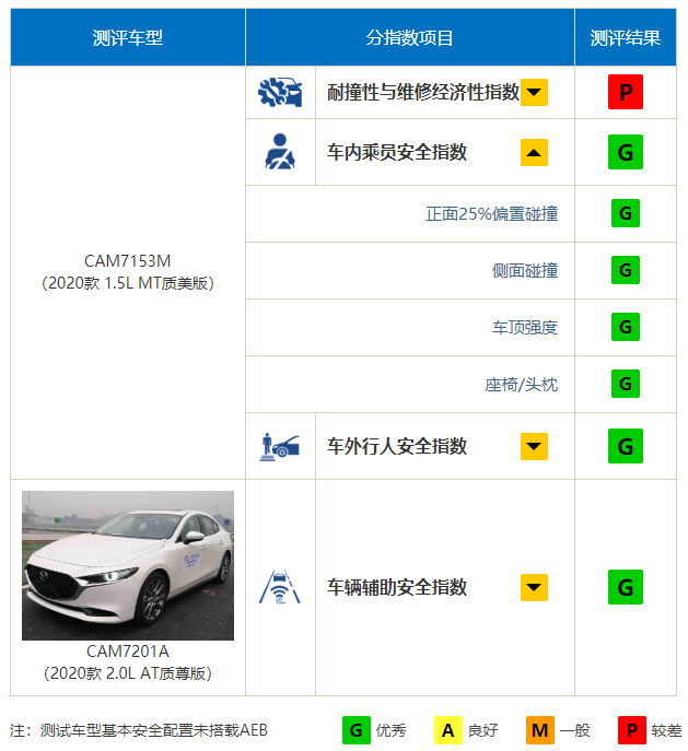 从总评分来看,新马3的总得分还是非常不错的,唯独低速碰撞得到了一个P(差),而车内乘员、车外行人以及辅助安全系统得分均为G(优秀),接下来我们就针对这些项目来逐一分析。