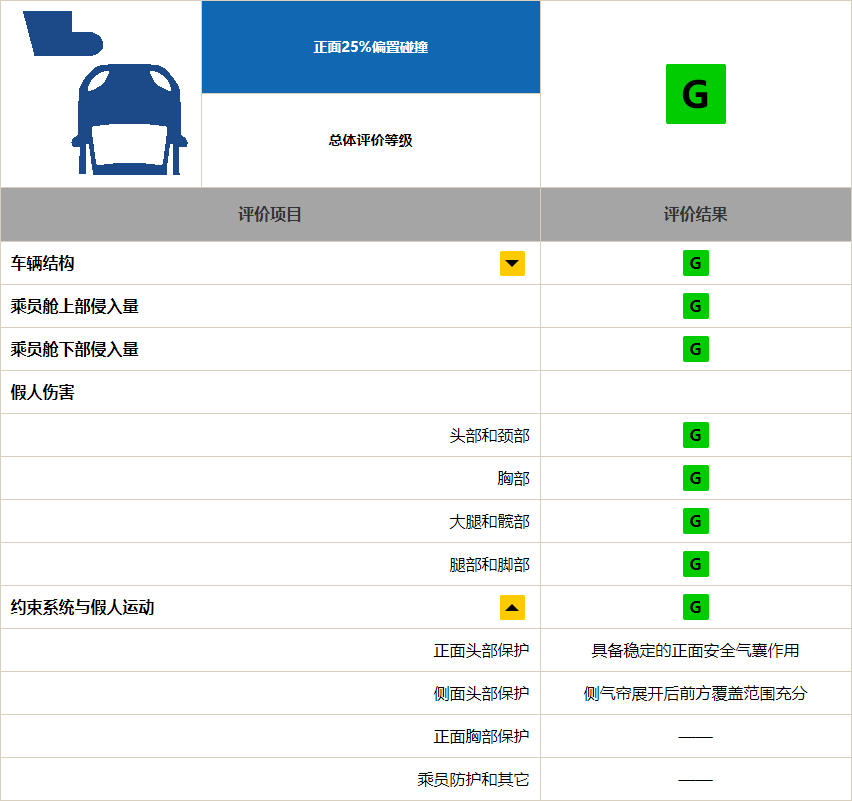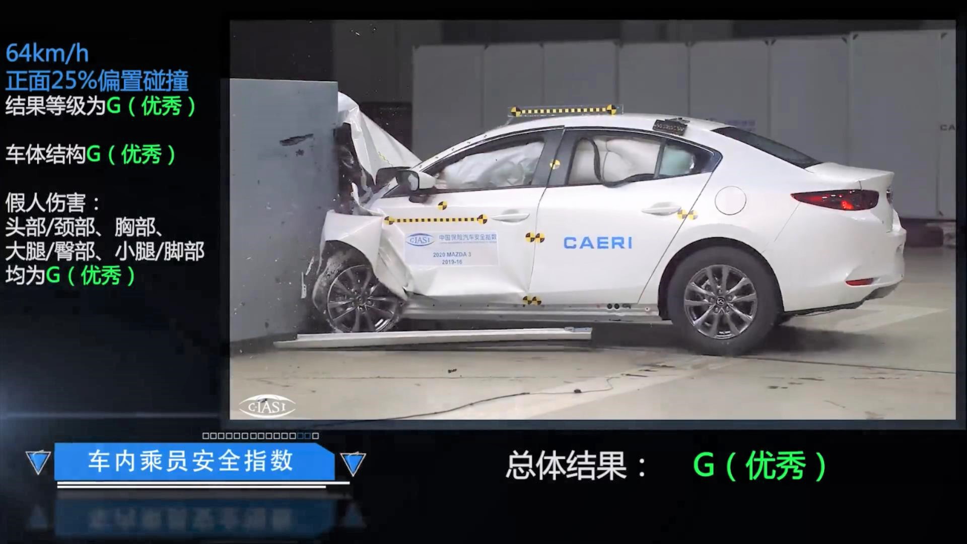 接下来是最为重要的25%偏置碰撞了,在这项测试中,马自达3的表现非常优秀,总评分为G(优秀),所有单项得分也均为G。