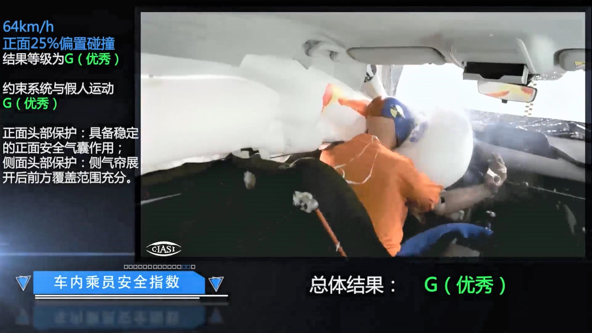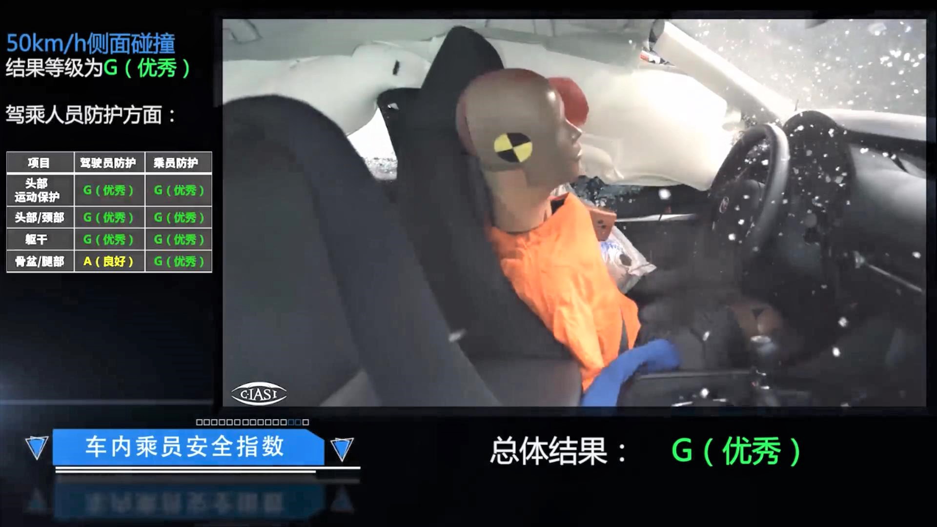 通过车内视角来看,前后排侧气帘在碰撞测试中的表现也非常稳定,有效保护了前后排乘员的头部。因此,马自达3的侧面碰撞总评分为G,也是目前中保研测试过的紧凑型轿车中的顶尖水平。