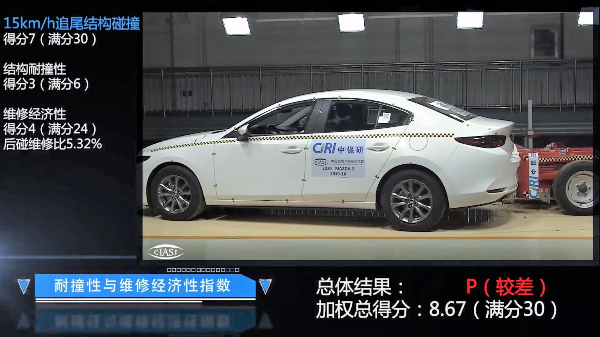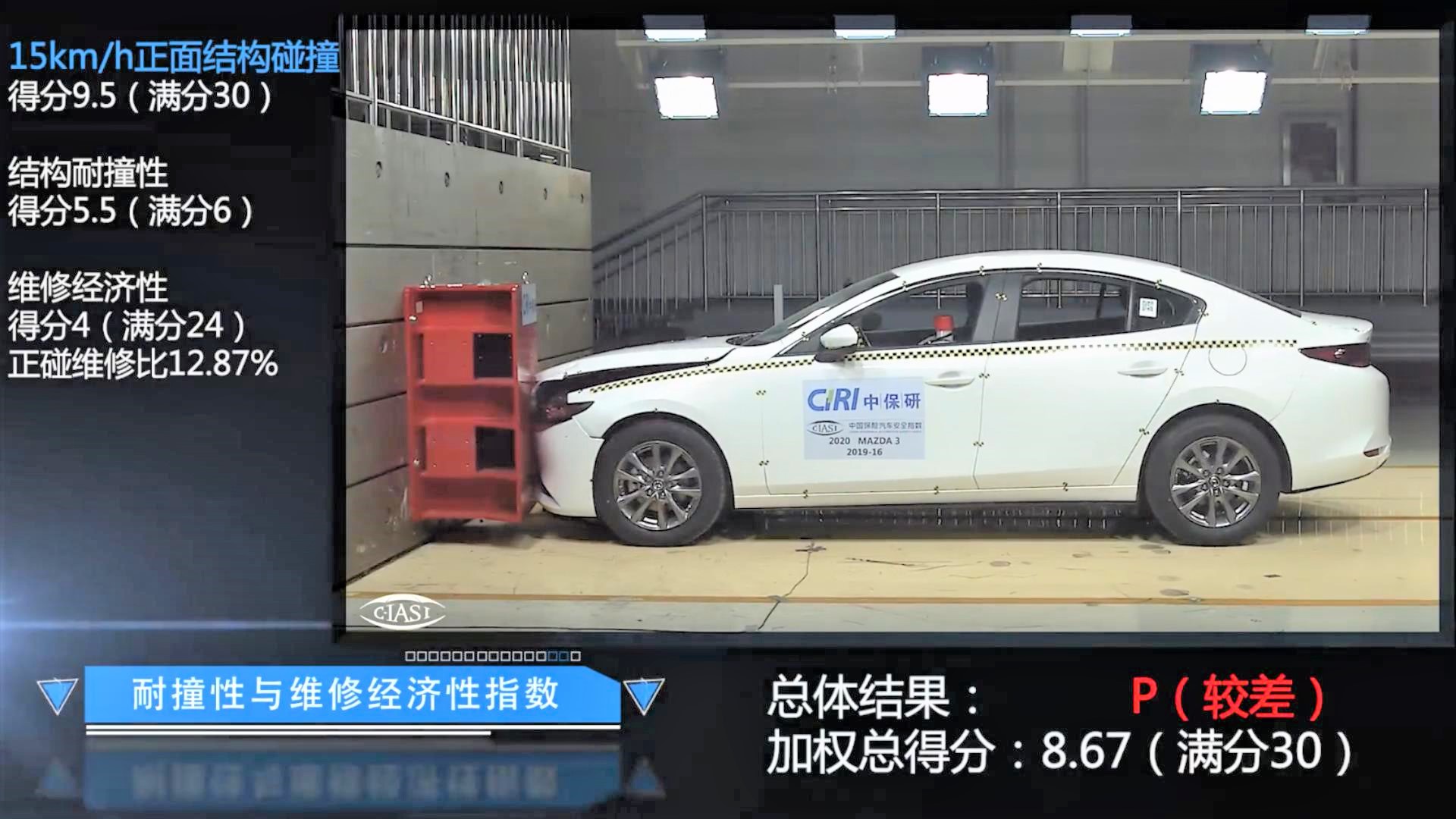 在时速15km/h的低速碰撞测试中,马自达3获得了P(差),主要原因还是修车偏贵。通过官方公布的评分来看,马自达3的正面维修经济性仅4分,维修经济占比为12.87%,按照测试车型11.59万的指导价来计算,修车价格为14916元,看来马自达前脸的大嘴中网和LED大灯修起来是真的不便宜!
