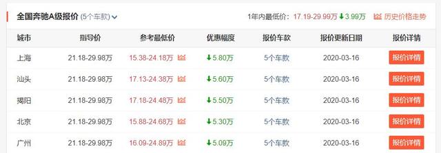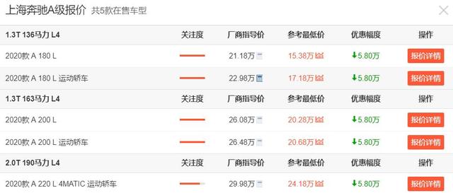 来看价格,奔驰A级的官方指导价是21.18-29.98万,该车型最早在2019年正式上市,所以目前来说也还算是一款准新车。不过,可能是碍于奥迪A3 (配置|询价)和宝马1系这哥俩的优惠实在太大,奔驰A级现在在终端的优惠情况也是大的惊人。根据上海地区经销商给出的报价我们能看到,奔驰A级现在的参考最低价已经来到了15.38-24.18万元区间,最高降价也来到了5.8万元,而且是全系都这样。至此,我们也就不得不说,降价后的奔驰A级闻着是"真香"。