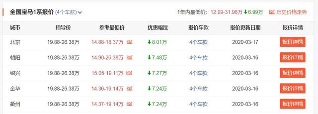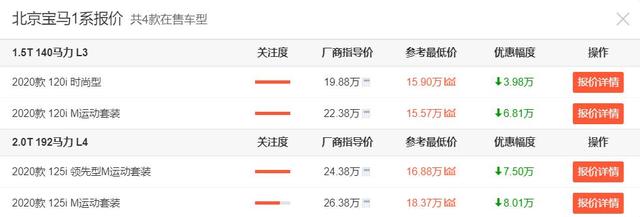 就这样,宝马也就不得不对1系车型实行降价促销,具体来看,目前全国大部分地区的经销商都对1系三厢给出了6-8万元的优惠,其中北京地区优惠最大,经销商参考最低价已经给到了14.88-18.37万区间,最高降价来到了8.01万元,可以说是相当值得入手了。