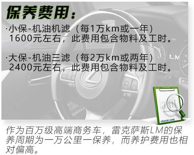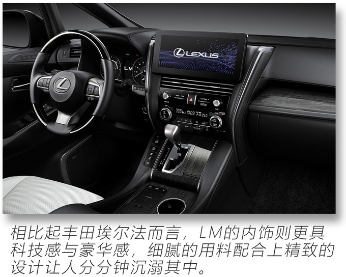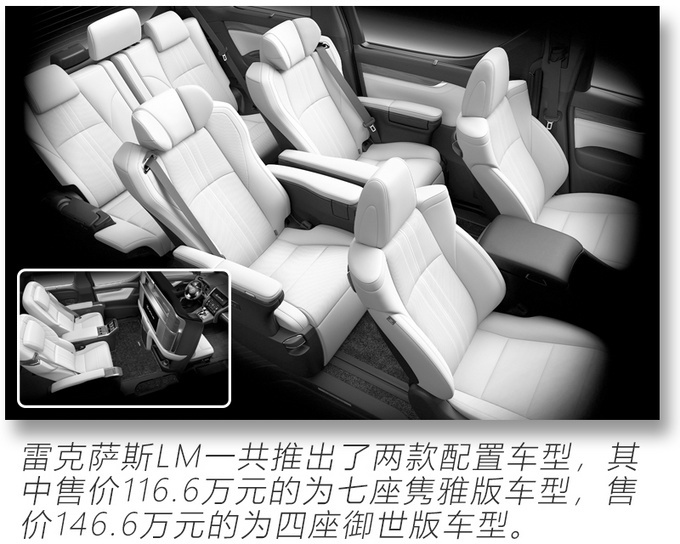 雷克萨斯LM推出了两款车型,其中售价116.6万元的七座隽雅版比售价146.6万元的四座御世版贵了30万,两者间不仅只是差了三个座位而已,虽然按在外观、动力、底盘和悬架上两款车型并无差别,但是对于这款售价超百万的MPV,相比外观其实内饰设计、配置与空间才是最主要的。