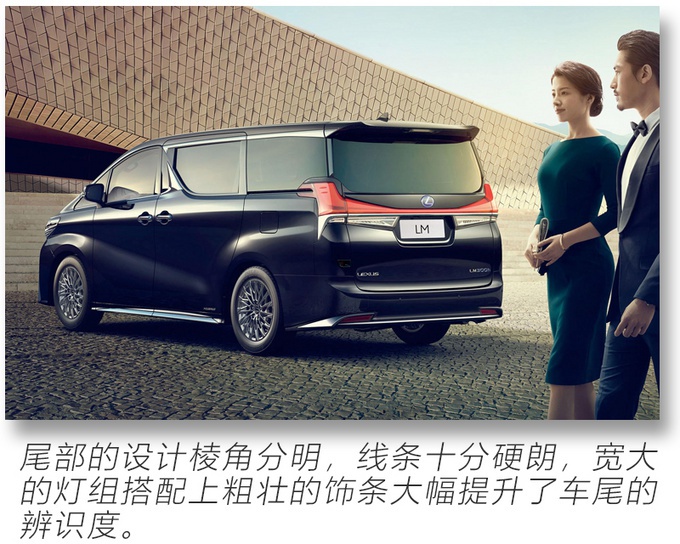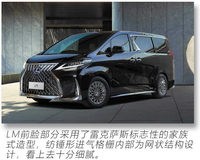 LM虽然整体外观延续了高端MPV埃尔法的轮廓,但细节上延续了雷克萨斯标志性的家族式造型,纺锤形进气格栅内部采用网状结构设计,而两侧的头灯组由三颗矩阵式灯珠组成,搭配勾型LED日行灯有着强烈的视觉冲击。目前LM车型分为两款配置,分别为300h七座隽雅版和300h四座御世版,售价为116.60万~146.60万。