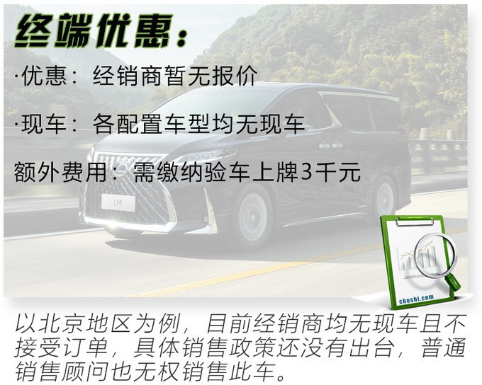 近日有网友给我们留言:我自己开公司有商务接待需求,想买台商务车,以前只觉得丰田的埃尔法 (配置|询价)还算比较有排面的,但自从雷克萨斯的LM出来后我就改变了想法,就想搞一台这个,不知道现在能不能直接提车?为了解答这位网友的问题,车市探店小分队走访多家雷克萨斯经销商以消费者的身份对车型库存、实际销售情况以及终端优惠政策进行相关询问。