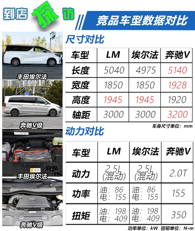 雷克萨斯LM (配置|询价)长宽高分别为5040/1850/1945mm,轴距为3000mm,据雷克萨斯介绍,除车身尺寸均较丰田埃尔法有所增长以外,在悬架舒适性调教方面也更胜一筹。动力方面,雷克萨斯LM两款车型均搭载混动系统,ECVT变速箱+电动四驱。2AR-FXE的2.5L引擎以及前后两台电动机,综合最大输出120KW,综合油耗低至7.1L/100km,