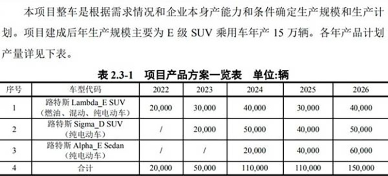可以看到,该工厂将在2022年建成投产,而首款投产车型为路特斯Lambda-E SUV车型,该车型将会有3个动力版本,包含传统燃油、混动以及纯电动。而剩下的1款SUV和轿车均为纯电动版车型。