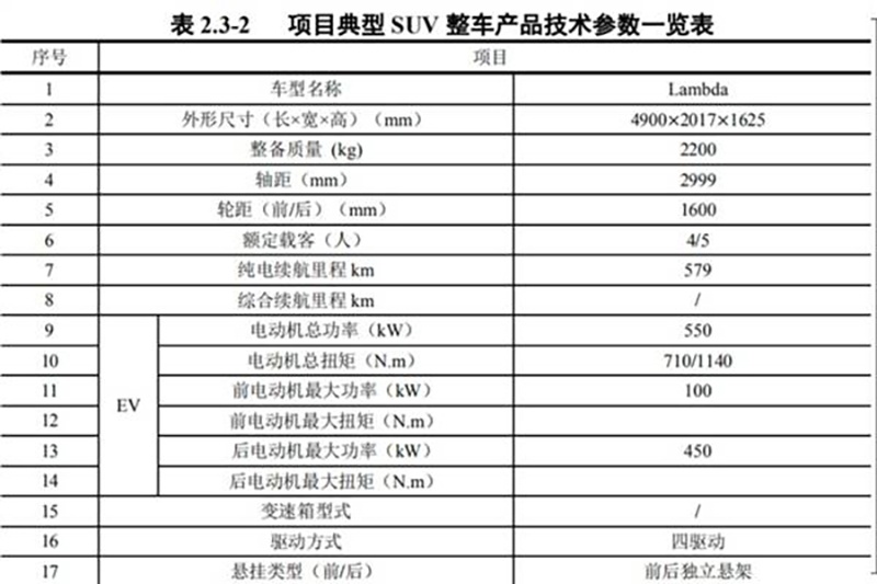 另外,我们还获取到了路特斯Lambda-E SUV车型纯电动版的相关信息。新车的车身尺寸上,长宽高分别为4900/2017/1625mm,轴距为2999mm。其整备质量为2200千克,有4/5座的座椅布局;纯电续航里程为579公里;并采用前后双电机的驱动系统,前电机最大功率100千瓦,后电机最大功率450千瓦,系统总功率为550千瓦。