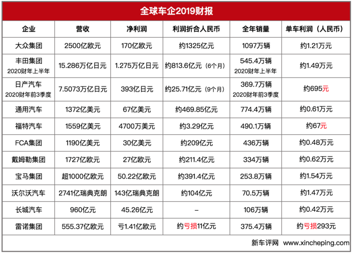基于这个想法,我就把目前已经公布的车企2019年财报做了一个简单的整理,得出这个表格。