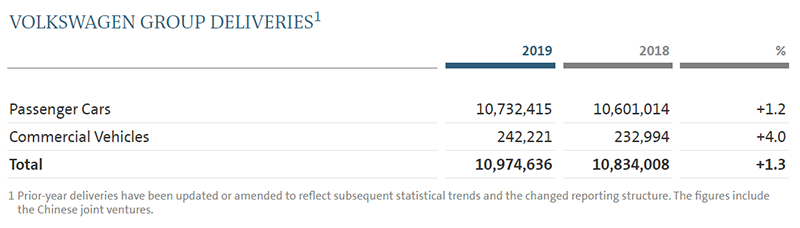 ● 2019年,大众汽车集团的汽车销量1095.6万辆,同比增长0.5%。