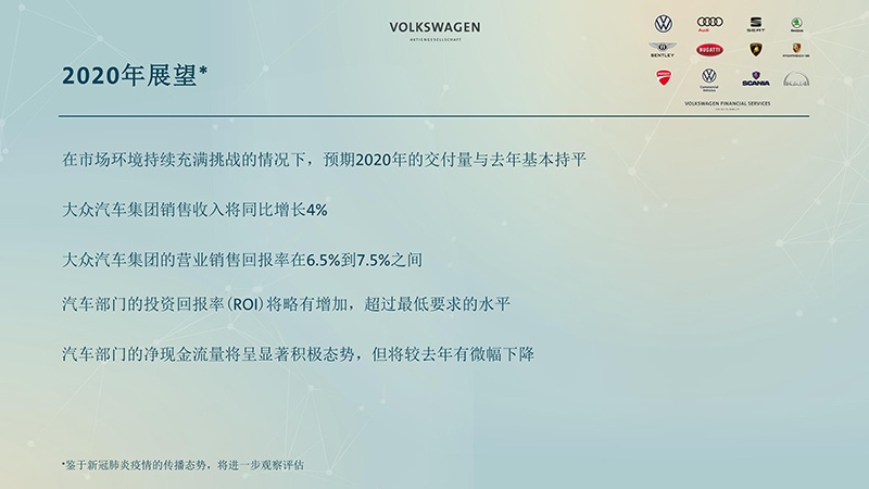 虽然市场环境充满挑战,但大众汽车集团保持较为乐观的态度,并且表示预期2020年的交付量与去年基本持平。同时,预计集团的销售收入将同比增长4%。此外,大众汽车集团还预期2020年运营销售回报率将在6.5%至7.5%之间。并且汽车部门的投资回报率(ROI)将略有增加,超过最低要求的水平。