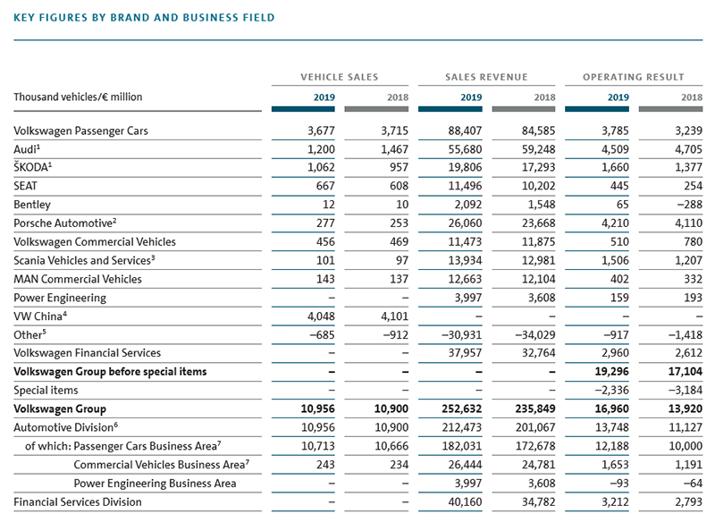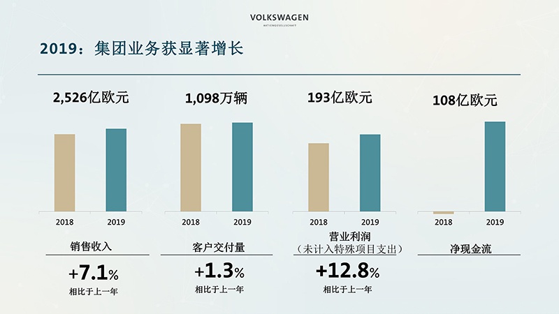 根据财报显示,大众汽车集团2019财年,全年销售收入达2526亿欧元,较上年增幅7.1 %; 2019年大众汽车集团未计入特殊项目支出的营业利润为193亿欧元,同比增长12.8%,创历史新高;扣除特殊项目支出后的营业利润达170亿欧元(其中柴油发动机排放事件负债有关的支出为23亿欧元)。汽车业务的净现金流增长至108亿欧元,上一财年为-3亿欧元。