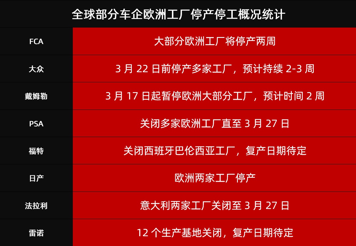 以目前的消息来看,全球各大车企已经感受到来自疫情的压力,纷纷停产关厂保平安,从意大利开始蔓延至整个欧洲。