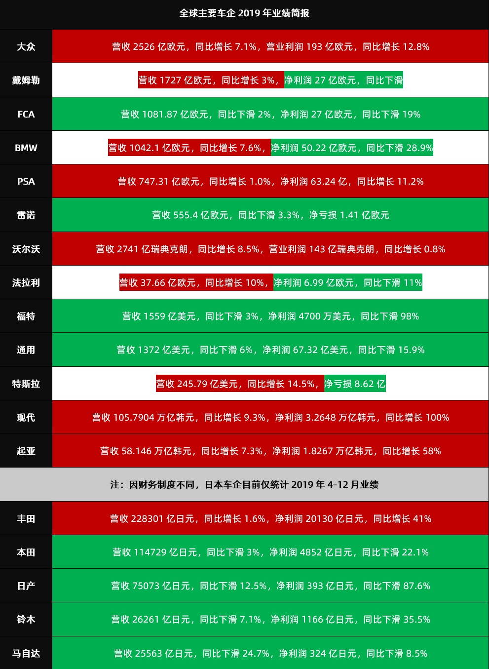 看看上表不难发现,2019年简直是一片翠绿盎然的景象,在2019年实现了营收和净利润双丰收的车企,可谓是少之又少,部分车企虽然营收增长,但净利润却下滑严重,其中更是不乏戴姆勒和BMW这样的著名企业。