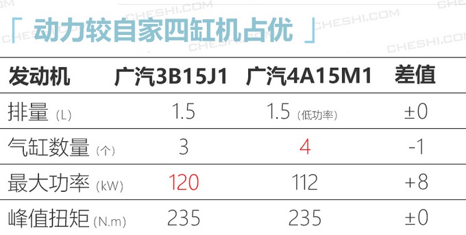 动力方面,传祺新款GS3继续搭载代号为“3B15J1”的1.5T三缸发动机,采用全铝机身,应用了GCCS燃烧控制技术,及350bar超高压缸内直喷系统,与家族GS5搭载的1.5T低功率四缸机相比略占优势。传动系统由现款车型的7速双离合变速箱调整为6速手自一体变速箱,换挡过程会更加平顺,低速行驶时可避免出现抖动现象。