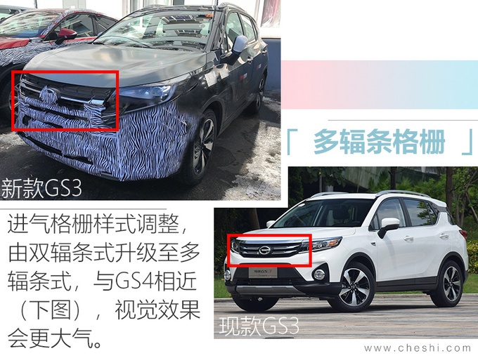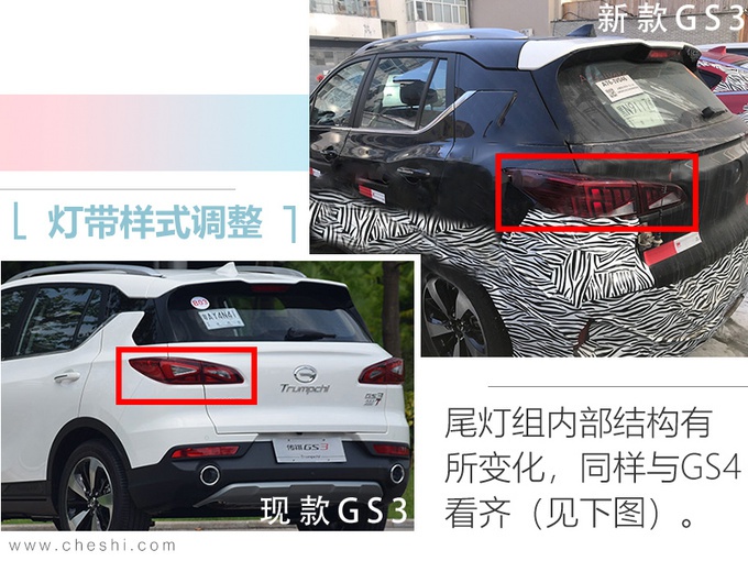 外观方面,传祺新款GS3设计风格向GS4靠拢,前脸装配新样式头灯组,目测内部采用了LED远近光一体式光源,也是目前全系没有采用的,但转向灯仍为卤素光源。车侧后视镜和车尾扰流板由白色元素装点,量产车型中或为中高配车型专属。车尾灯组造型与现款车型一致,内部灯带取消了三角形元素,取而代之的是竖条状。