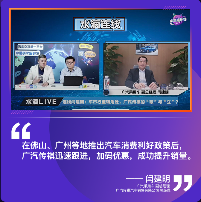闫建明表示,广汽传祺抓住机遇,快速响应国家政策,跟进刺激汽车消费。“在广深市场,我们带来8亿巨献十重大礼,助力广深两城车主,包括主销车型至高优惠15000/台的现金礼、线上购传祺GS3 (配置|询价)/GS4享‘99元抵2000元’的网购礼、购车免费升级车规级CN95高效空调滤芯的健康礼等。在佛山市场,我们在政府补贴基础上,加倍福利回馈车主,推出佛山车主购车可享补助4000元,置换可享最高优惠11000元,8亿十重大礼等专属优惠政策。”
