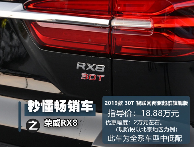 荣威RX8全系共推出6款车型,官方售价区间为16.88-22.88万元。动力总成上,车辆全系搭载一台2.0T涡轮增压发动机,最大功率163kW,峰值扭矩为360N·m,匹配6速手自一体变速箱。现阶段以北京地区为例,荣威RX8存在有2万元左右的优惠幅度。而我们今天介绍的主角2019款 30T 智联网两驱超群旗舰版,官方售价为18.88万元。并且通过上图也可以看到,即便是一款中低配车型,配置方面也很厚道。