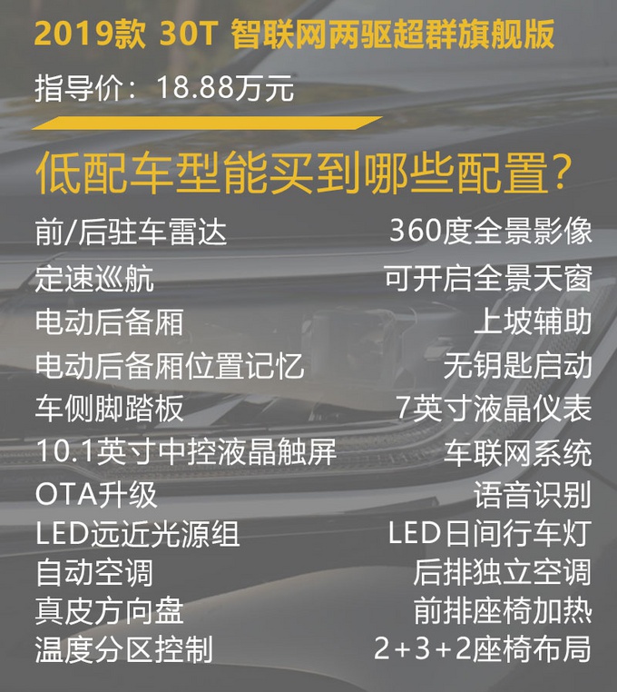 可以看到,虽然身为荣威RX8车型中的中低配车型版本,但是30T 智联网两驱超群旗舰版在配置方面的表现却很不错,而且很多配置还做到了全系标配,相信能够带给它的用户群体上乘的用车感受。当然,车辆所采用的非承载式车体结构,不但在同级别和同价位众多车型中非常少见,对于自身来说也是一种优势。此外,2+3+2的7座座椅布局也很讨众多7座买家的欢心。所以,以不到20万的价格能够买到这款配置足、大空间、通过性强的7座SUV车型,真的很给力。