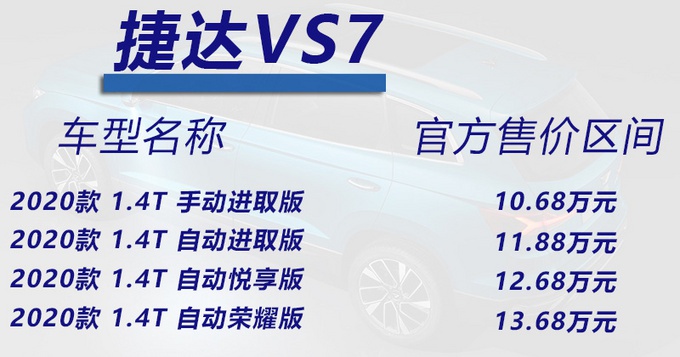 前段时间,为了保障部分紧急用车客户的正常出行,捷达品牌以“尝鲜价”向其交付了2020辆捷达VS7 (配置|询价)现车资源,而这种做法不仅受到消费者们的广泛好评,也让捷达VS7获得了更高的关注度。现如今,捷达VS7终于迎来了正式上市,新车全系共推出4款车型,官方售价区间为10.68-13.68万元。那么接下来我们就一同研究下,在这4款车型中究竟买哪款更有性价比?