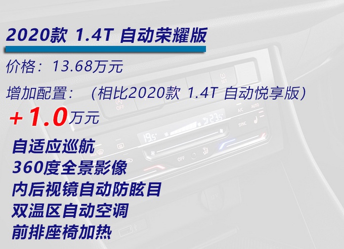 最后的对比则是在全系顶配的自动荣耀版与自动悦享版中进行。在配置上,自动荣耀版要比自动悦享版多出自适应巡航、360度全景影像、内后视镜自动防眩目、双温区自动空调和前排座椅加热等配置。在价格上两者相差1万元。