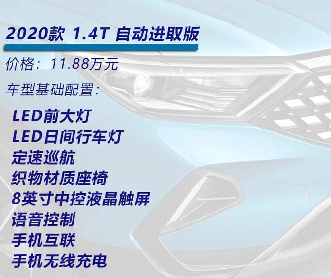 作为自动挡车型入门版的自动进取版,在配置上,配备有LED前大灯、LED日间行车灯、定速巡航、织物材质座椅、8英寸中控液晶触屏、语音控制、手机互联和手机无线充电等基础配置。很值得称赞的是,LED前大灯、LED日间行车灯和手机无线充电等配置做到了全系标配。