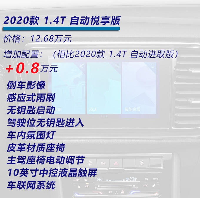 之后的自动悦享版在价格上,要比自动进取版多出0.8万元,配置上则分别多出倒车影像、感应式雨刷、无钥匙启动、驾驶位无钥匙进入、车内氛围灯、皮革材质座椅、主驾座椅电动调节、10英寸中控液晶触屏和车联网系统等配置。