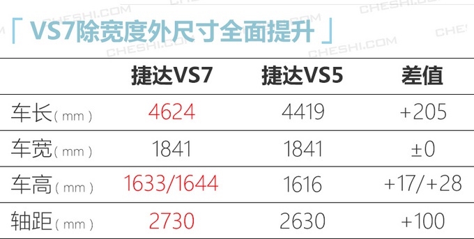与捷达VS5相比,VS7除宽度外其他方面均进行了加长,车内后排乘坐空间和后备厢空间也得到进一步提升。与现代ix35、吉利博越PRO主要竞品相比,新车的尺寸优势依然明显。动力方面,捷达VS7搭载大众EA211系列1.4T发动机,动力参数介于现代1.4T与吉利1.5T之间,传动系统匹配5MT或6AT变速箱。