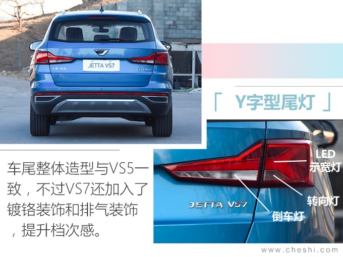 VS7沿用了捷达品牌家族外观设计语言,细节上使用镀铬装饰营造出一定的豪华感。新车进气格栅集成了ACC毫米波雷达探头,全系标配透镜式LED自动大灯,前保险杠中央使用镀铬饰条进行点缀。VS7侧面造型更加修长,根据不同配置提供17/18英寸共3种样式轮毂,新车后保险杠下方银色护板四周也使用了镀铬饰条,与车头相呼应,两边还加入了排气装饰,进一步提升了整车的档次感。