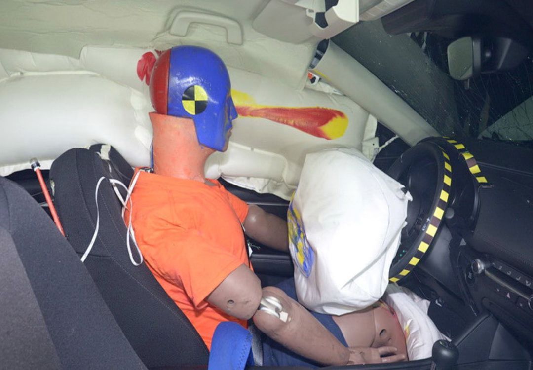 从车内视角来看,全新马自达3的正气囊、侧气帘以及膝部气囊保护了驾驶员的安全,没有出现气囊气囊失效等情况。值得一提的是,测试车型为最低配马自达3,全系标配7个安全气囊。