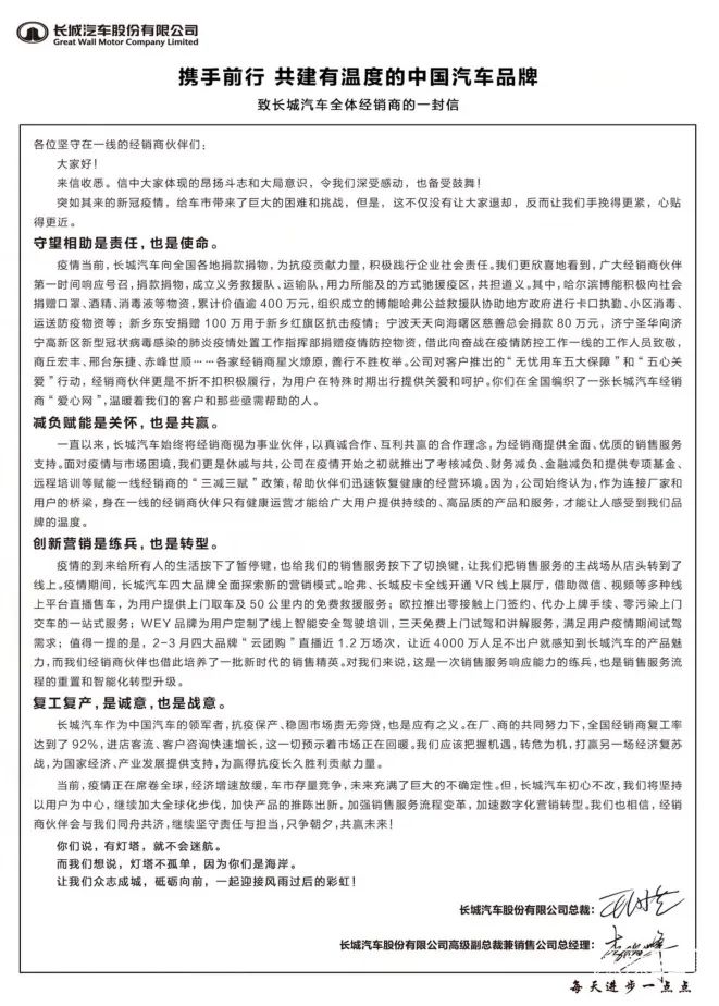 前不久,长城汽车经销商联名“上书”魏建军突然火了,很容易让人联想到最近两年一些品牌经销商上演的倒逼主机厂戏码,就算长城汽车这些年发展非常好,面对车市寒冬与疫情的影响,可能也是向厂家要更多的政策渡过难关,但实际上,这封信的内容是对长城汽车厂家在疫情期间的支持表示感谢,以及对未来发展的信心。