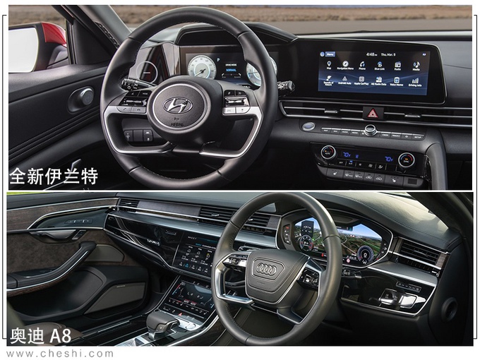 内饰部分,新车整体设计风格更偏第十代索纳塔,采用了双10.25英寸连屏设计理念,下方为贯穿式空调出风口,细节处辅以灯带。新车方向盘采用了双辐式设计,整体造型与奥迪A8相似度较高。