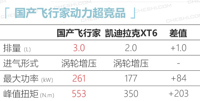 此前的申报信息显示,国产飞行家将搭载与现款飞行家相同的进口3.0T V6涡轮增压发动机,最大功率为261kW,峰值扭矩预计仍为553N.m,传动系统预计将匹配10速自动变速箱。目前豪华品牌中仅凯迪拉克拥有国产中大型SUV,未来国产飞行家上市后将与其展开竞争。新车搭载的3.0T发动机动力占据优势,在尺寸方面除高度外均占优。