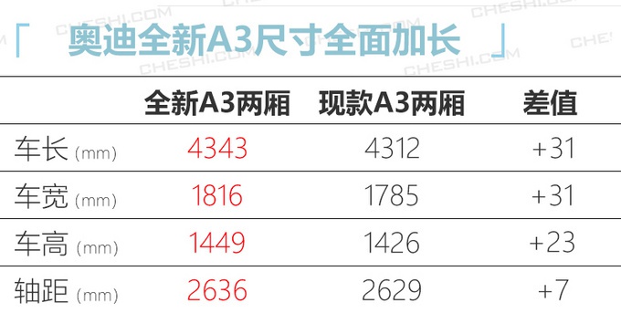 尺寸方面,基于MQB模块化架构打造的全新A3进行了调整,车长大幅加长至4.34米,轴距则由2.62米增至2.64米。另外国产三厢版车型还首次进行了轴距加长,预计将大幅领先主要竞品宝马1系。动力部分奥迪全新A3将搭载1.4T、2.0T涡轮增压发动机(明年一汽-大众1.5T发动机投产后将替代1.4T机型),传动方面匹配7速双离合变速箱。