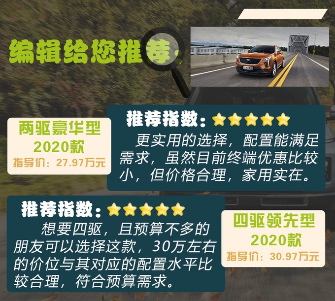 凯迪拉克2020款车型上市已经有一段时间了,市面上也有不少相关的导购推荐,相信大家也不陌生。本期主要结合需求,有针对性的给出购买建议—网友A、预算不多,求推荐一款价格实惠,配置够用就行的车型,四驱用不上。网友B、想要四驱,配置要求不高,价格实在点的车型。首先说结论,针对网友A的需求,笔者推荐次低配的28T 两驱豪华型;而网友B则推荐四驱入门的28T四驱领先型。为啥?接着往下看。