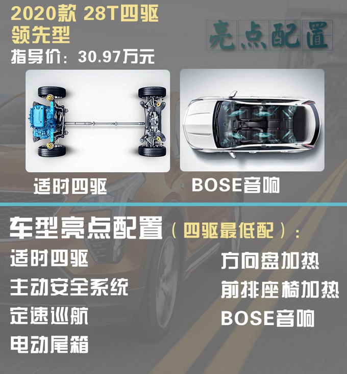 针对网友B的需求则推荐28T四驱领先型,虽然是XT4四驱车型的入门款,价格不贵,但各方面的表现都不俗。这套适时四驱系统能够实现主动扭矩控制,根据实际路况,配合不同的驾驶模式给各轮胎分配扭矩,有更好的非铺装路面通过性。车型配置方面也比较完善,车道保持、主动刹车、偏离预警等主动安全配置应有尽有,标配BOSE音响、前排座椅加热、全景天窗、电动尾门。这位网友虽然虽对配置方面要求不高,30万元左右选一台豪华品牌四驱SUV,XT4肯定是同级别配置水平最高的车型之一。