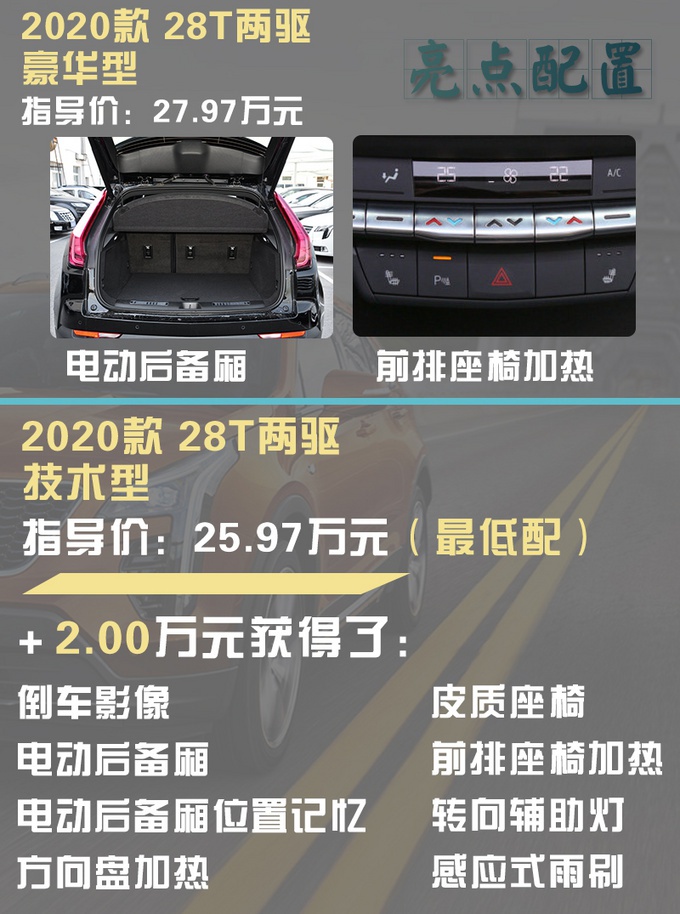 这位网友因为预算不多,需求是价格实惠、配置够用,所以一些高配和顶配车型就不用考虑了。次低配的28T两驱豪华型是比较合适的,作为豪华品牌车型,XT4的基础配置就不低,诸如全系一致的动力总成、标配18英寸铝合金轮圈、定速巡航、全景天窗、LED远近光灯等。但对于豪华品牌车型来说有些太简陋,您也不想哥们朋友上车就吐槽,没有档次感吧。28T两驱豪华型在入门车型的基础上,升级了带加热的皮质座椅以及方向盘,提升了舒适性和档次感;此外,电动尾门、倒车影像等对于SUV来说都是非常实用的配置。总的来说,钱都花在了实际用处,增加两万元预算,整体提升还是很明显的,也满足这位网友的需求。