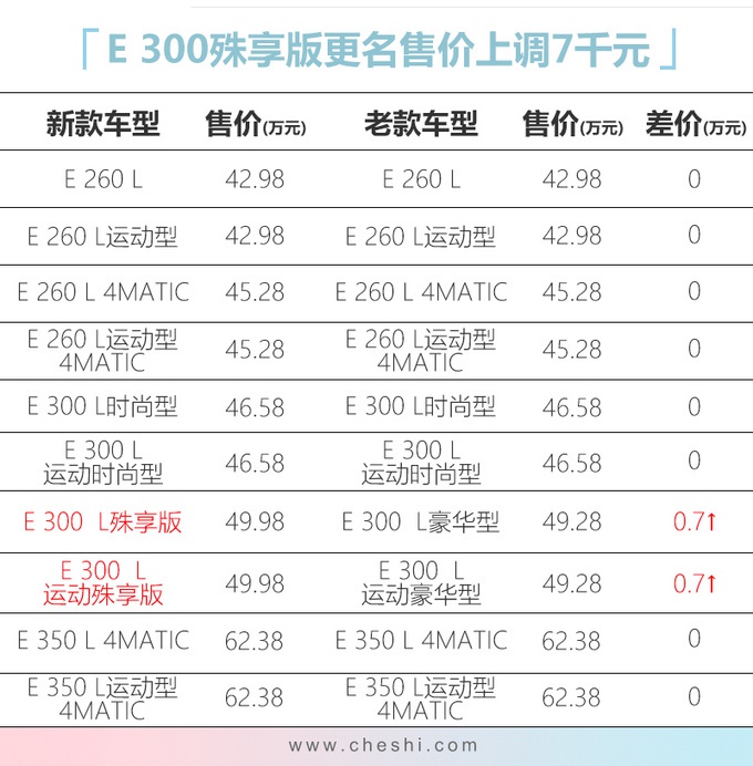 近日网上车市从梅赛德斯-奔驰官网获悉,2020款改款E级长轴距正式上市,共推出10款配置车型,售价区间为42.98-62.38万元。其中老款E 300 L豪华型/运动豪华型更名为E 300 L殊享版/运动殊享版,并增加多项配置,同时价格也上调7,000元。