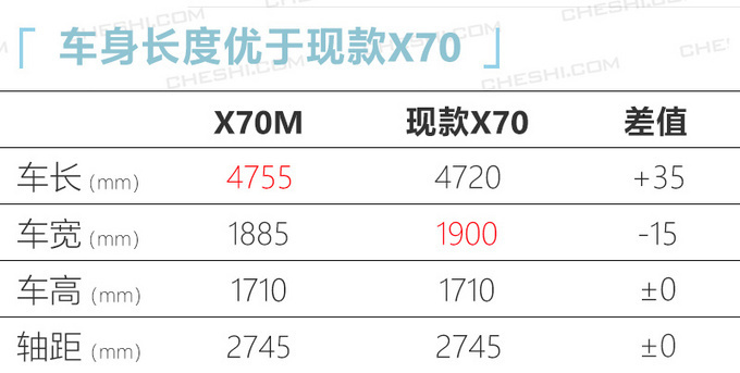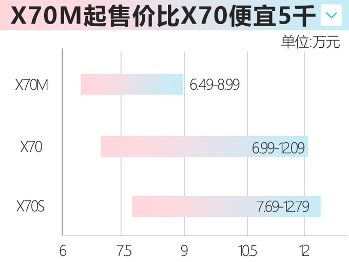 X70 (配置|询价)系列是奇瑞控股捷途最畅销的产品,凭借大空间、高性价比等优势,一经推向市场就获得了众多消费者的青睐,月均销量进入万辆“俱乐部”。此前该车型已经推出了普通版X70,偏运动化的X70S两款车型。3月23日,X70系列迎来第三位成员——X70M,更加注重性价比。新车共推出5款车型,售价区间为6.49-8.99万元。另外,新车相比现款X70再次进行加长。从价位以及空间两个层面来说,可以说是“同级无对手”。(注:上述售价为5座车型价格,6座、7座车型在同版型5座价格基础上加价2000元。)