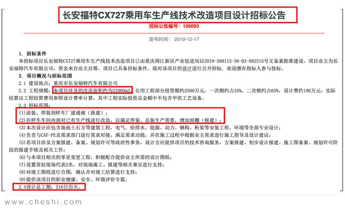目前长安福特已经启动了CX727乘用车生产线技术改造项目设计,以及CX727三大件、地板总成、主拼焊装生产线及侧围、门盖、白车身焊装生产线的招标工作。其中生产线技术改造项目设计总工期为216天,预计Mustang Mach-E将在2021年投产,并上市销售。
