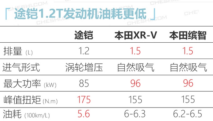 造型方面途铠1.2T与在售车型保持一致,整体设计风格较为硬朗。新车前脸格栅内部加入了双横幅镀铬饰条,两侧为配有加入透镜结构的全LED大灯组。动力部分,大众途铠1.2T发动机最大功率85kW,峰值扭矩175N·m,动力参数和本田XR-V (配置|询价)、缤智 (配置|询价)使用的1.5L自然吸气发动机相当。不过,新车油耗表现明显优于XR-V、缤智。
