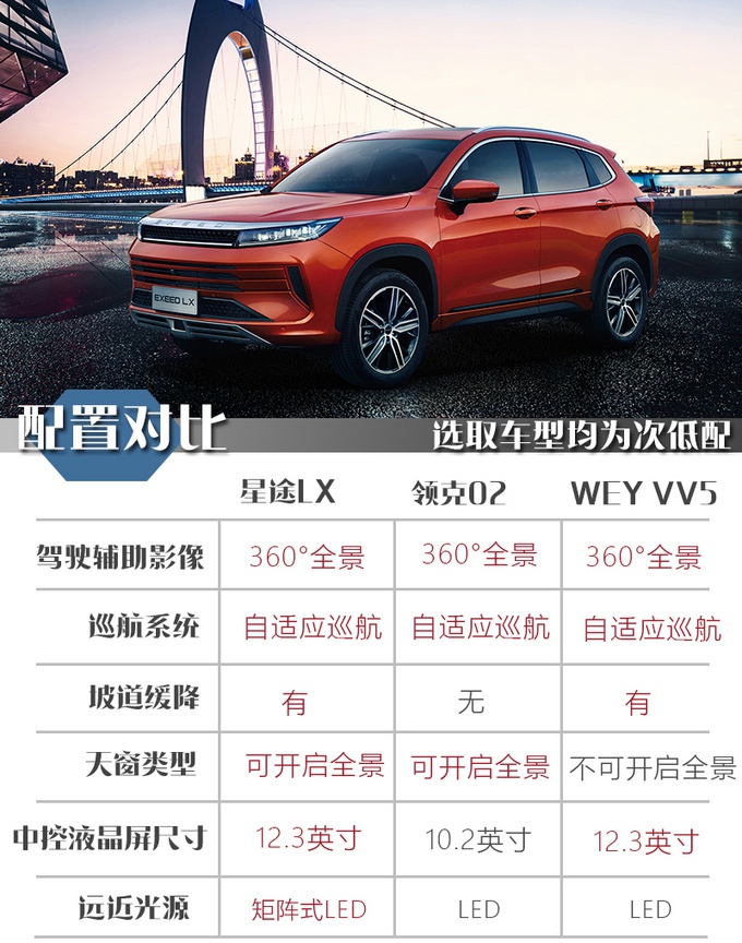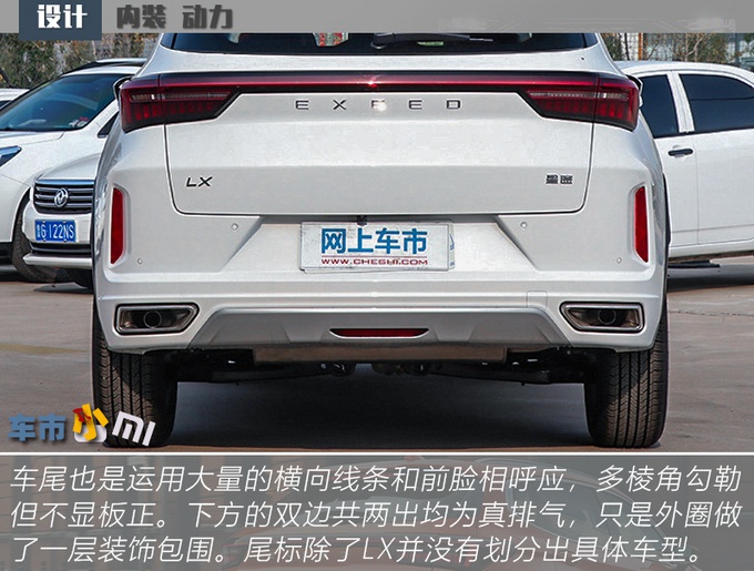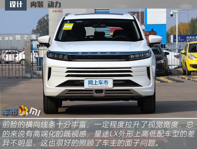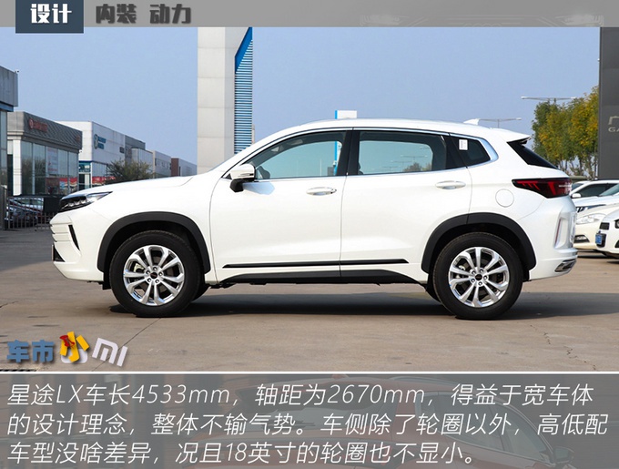 星途LX的整车尺寸放在紧凑级SUV来说并不算突出,不过设计上很讨巧,大量横向线条的运用使得人的视觉效果被拉宽,相比于同级别车型来说,看起来更大一些。星途LX的整体设计和领克02走的是两个路线,前者把当下所有能被消费者认作好看的设计都叠加起来,全部都给你;而后者则剑走偏锋,尽量和市场上的车型凸显出差异化,以不一样标榜。最重要的一点是星途LX高低配车型在外形上的差异不明显,很照顾车主的面子问题。