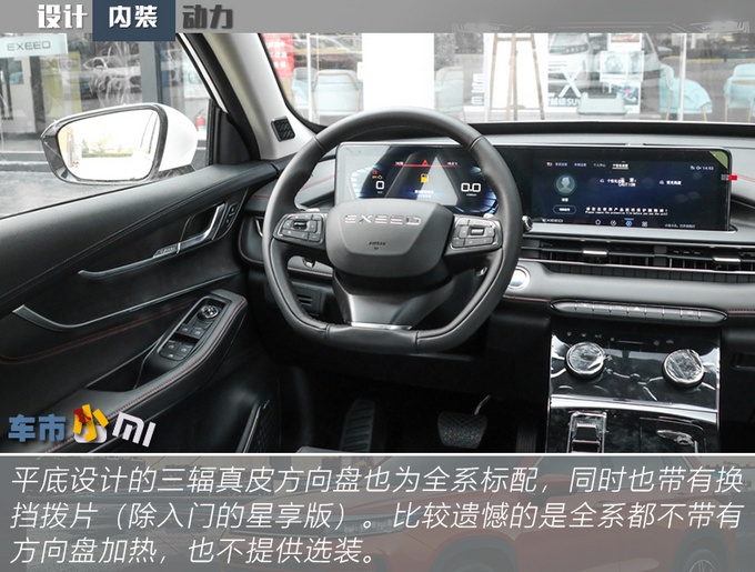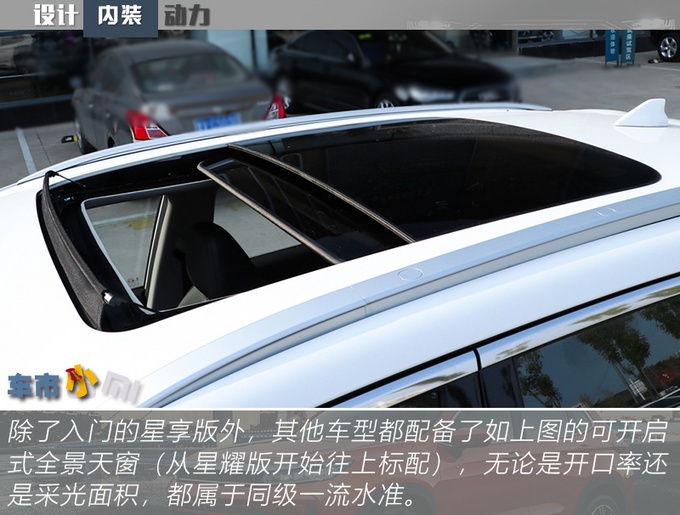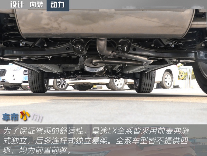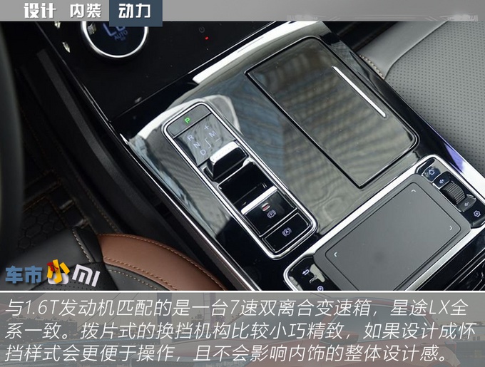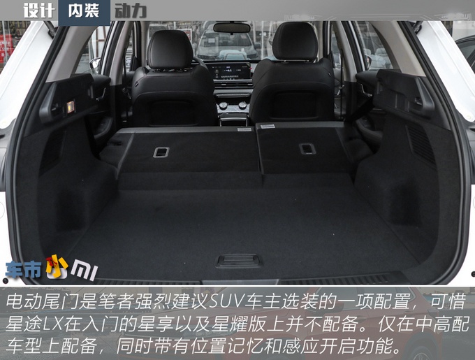 配置方面,星途LX尽可能的把这个价位能给你配置都配全了,真皮方向盘、18英寸轮圈、LED远近光、360°全景影像、自适应巡航等等,入门车型的配置就比较完善。空间方面,中控台下方的镂空设计算是有些讨巧了,下方内置两个USB接口和一个12V电源,且还有无线充电板,可以充分满足前排乘客的充电需求。后备厢容积可由常规351L拓展至最大1174L,遗憾是实拍车型并不配备电动尾门。
