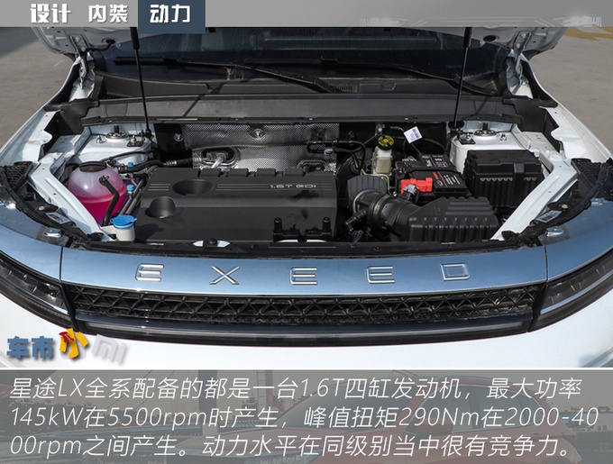 现款星途LX供推出4款配置车型,笔者较为推荐2019款 1.6T星耀版,也是今天的实拍车型,官方指导价为12.99万元,虽然是次低配车型,但无论是价格、配置还是动力匹配,笔者认为家用购入都十分合适。它拥有全系一致的动力总成,1.6T发动机最大可以迸发出197马力,对比同级别车型普遍使用的1.5T发动机,在动力表现上更有优势,且发动机热效率高达37.1%,也能带来更好的燃油经济性。同时它目前属于国六排放,全国各地都能上牌。