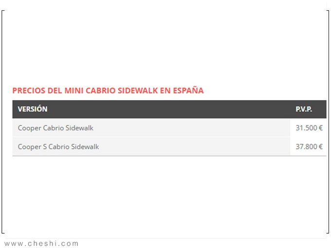 MINI COOPER是品牌旗下的小型轿车,该款车型早于2004年进入国内市场销售,并获得了诸多女性消费者的喜爱。目前新款MINI Cabrio已在西班牙地区开售,新车共计推出Cooper Cabrio Sidewalk、Cooper S Cabrio Sidewalk两款车型,起售价为31,500欧元(约为24万人民币)。据悉,新车将提供午夜黑金属色、白银色金属色、神秘黑色金属色、Moonwalk灰色金属色和Thunder Gray车身涂装。内饰将配备全液晶仪表以及嵌入式液晶屏幕,下方还选用了电子挡把,进一步提升了内饰豪华感。