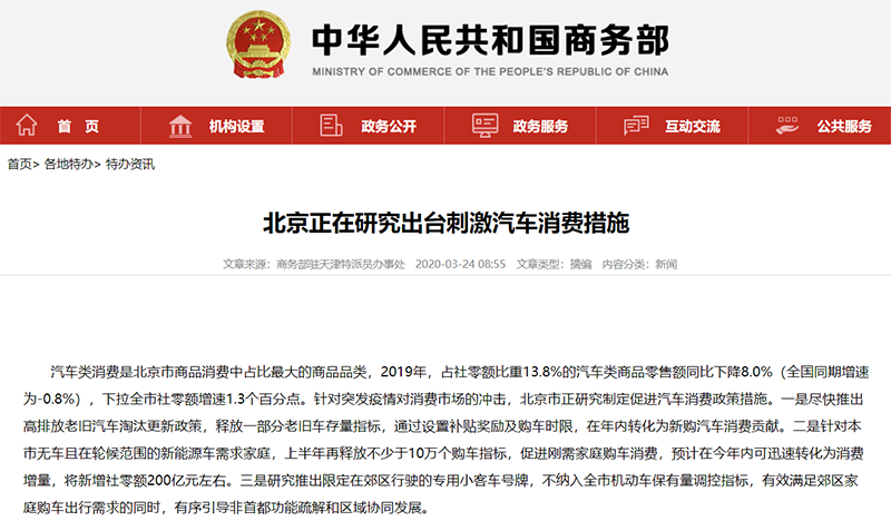 3月24日国家商务部发布的北京正研究刺激汽车消费措施的具体内容为:一是尽快推出高排放老旧汽车淘汰更新政策,释放一部分老旧车存量指标,通过设置补贴奖励及购车时限,在年内转化为新购汽车消费贡献。二是针对本市无车且在轮候范围的新能源车需求家庭,上半年再释放不少于10万个购车指标,促进刚需家庭购车消费,预计在今年内可迅速转化为消费增量,将新增社零额200亿元左右。三是研究推出限定在郊区行驶的专用小客车号牌,不纳入全市机动车保有量调控指标,有效满足郊区家庭购车出行需求的同时,有序引导非首都功能疏解和区域协同发展。