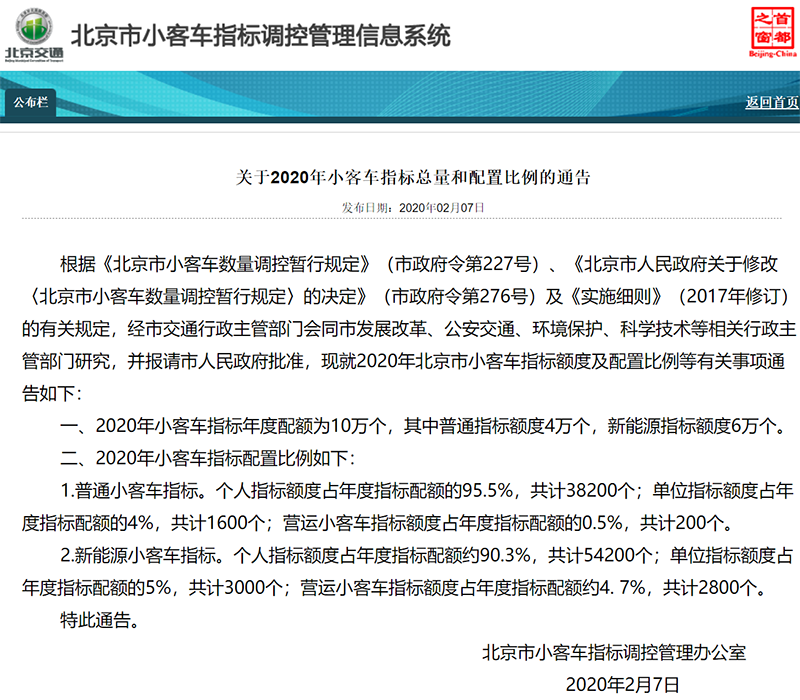 2020年北京市小客车指标年度配额,总共为10万个,其中普通指标额度4万个,新能源指标额度6万个。10万个年度配额指标中,普通车个人指标额度占比95.5%,共计38200个;新能源个人指标额度占比为90.3%,共计54200个。