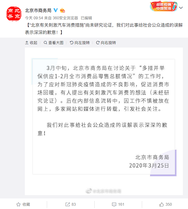 从回应中可以看到,3月中旬北京市商务局在探讨“多措并举保供应1-2月全市费品零售总额情况”的工作时为了应对新冠肺炎疫情造成的不良影响,促进消费市场的回暖,有人提出了刺激汽车消费的想法(未经研究论证)。后在内部信息流转中,因工作不慎被放在网上,多家网站和媒体进行转载,引发社会关注。
