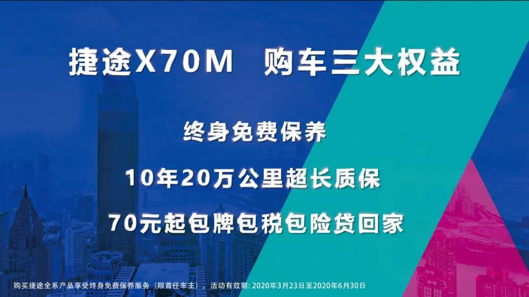 为了乘胜追击,捷途在3月23日以线上直播的形式推出了捷途X70M新款车型。新车共推出5款车型,售价为6.49-8.99万元,定位于中型SUV。此外,新车提供了10年20万公里超长质保,而前期购车用户还将享受终身免费保养、70元包牌包税包险等优惠政策。
