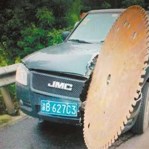 几十秒后,向先生终于回过神来,战战兢兢地下车查看情况。这一看,吓出了一身冷汗——原来,撞上他车头的是一个巨大的圆锯,这个大家伙稳稳插在引擎盖上,最深处切入车体50厘米。吓傻了的向先生呆立了好一段时间,才终于想起报警求助。